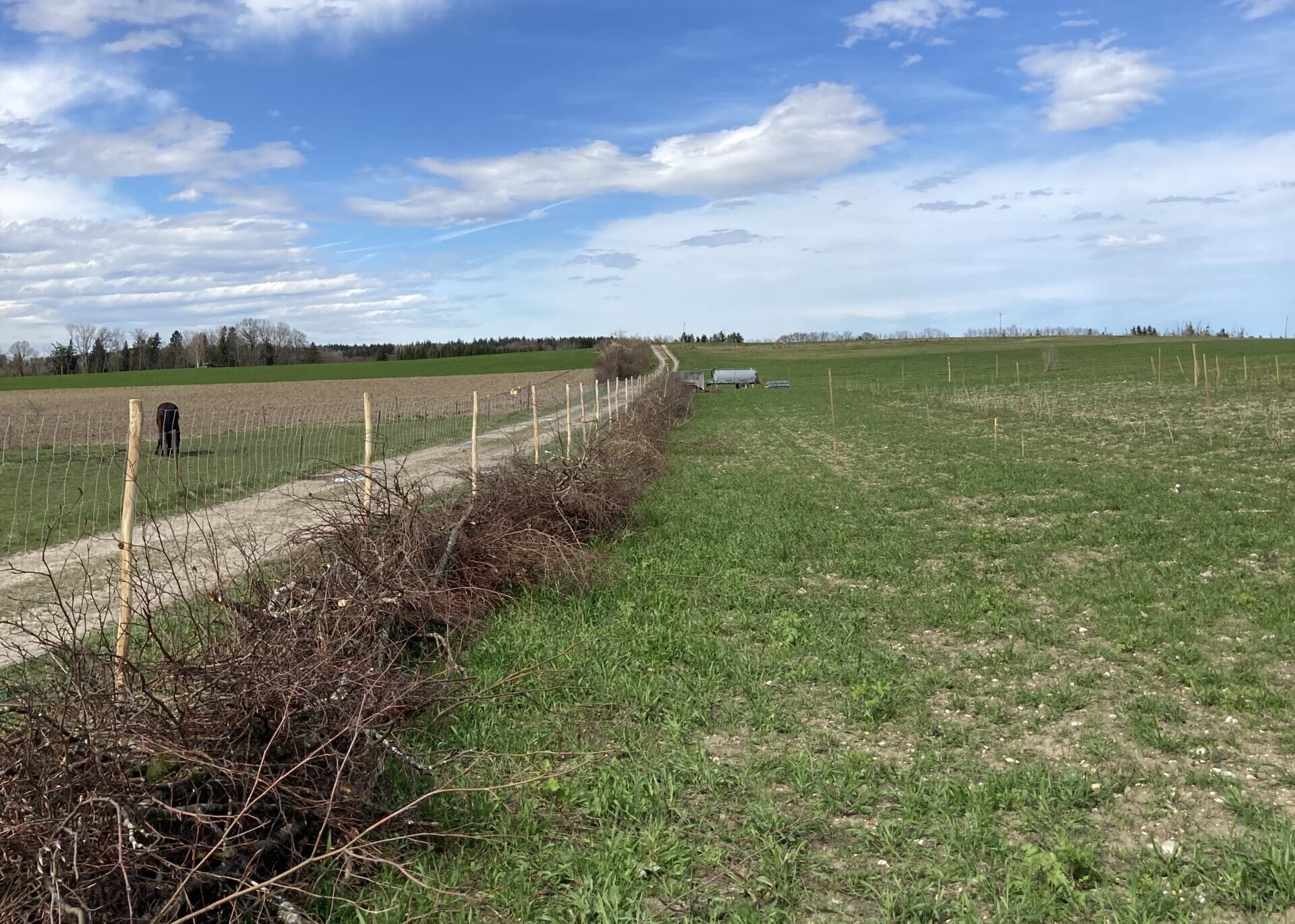 Eine Benjeshecke ist angelegt, jeweils eine Reihe Felsenbirnen, Johannisbeeren, Bayern – Kiwi, Himbeeren/Brombeeren sind gesetzt. 10 Reihen à 20 m für den Anbau von Biogemüse sind gefräst, abgesteckt, Kartoffeln gesetzt und die ersten Pflanzen gepflanzt. Holler, Haselnuss, und weitere Gehölze folgen im Herbst.